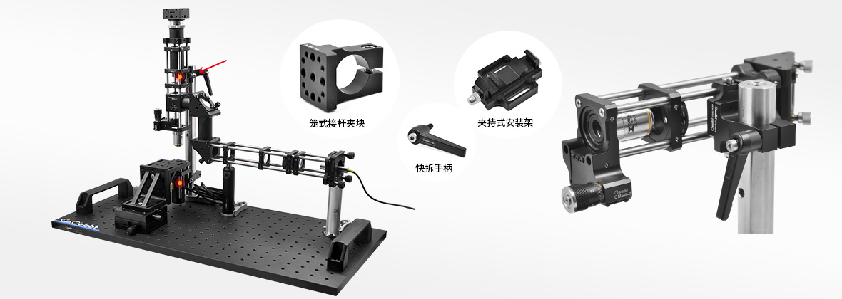 能夠提供剛性的通用安裝表面。這些安裝夾可以像面包板一樣用來固定我們的各種光機(jī)械安裝座。夾持機(jī)制可以直接兼容我們的?25mm接桿。通過沿接桿滑動(dòng)的背部夾持機(jī)制可以實(shí)現(xiàn)豎直方向的定位。一旦達(dá)到所需的垂直位置,使用鎖定螺絲啟動(dòng)夾持機(jī)制。快速連接夾持安裝架,用于30mm和60mm籠式系統(tǒng),方便嵌入和移出籠式系統(tǒng)。連接臺(tái)面有規(guī)則排列M6/M4螺紋孔可安裝不同的光機(jī)組件。單個(gè)鎖定螺絲允許單手操作。