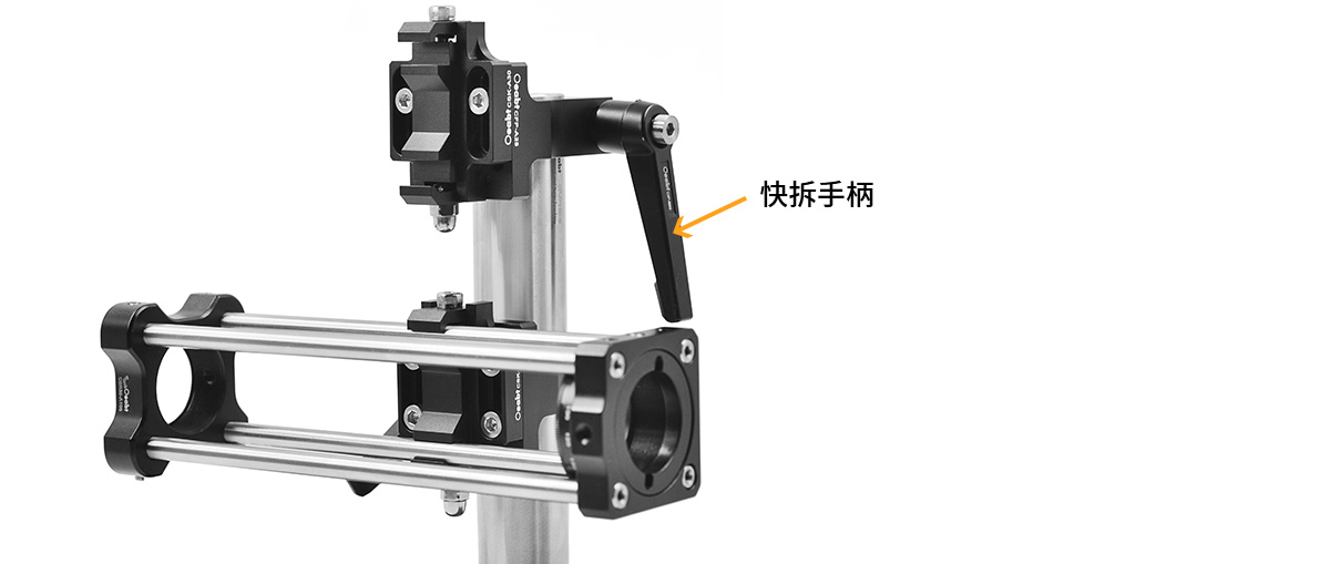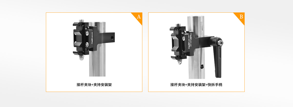 (2)這是安裝了快拆手柄的套件裝置,可快速調(diào)節(jié)夾持式安裝架:拆卸手柄用于將夾塊固定在接桿上。手柄長度2.36英寸(60mm) ,包含一個(gè)1/4"-20 (M6)螺栓,可直接旋轉(zhuǎn)手柄安裝,縮短了基本設(shè)置和對(duì)準(zhǔn)所需的時(shí)間,以便調(diào)節(jié)夾持式安裝架。
