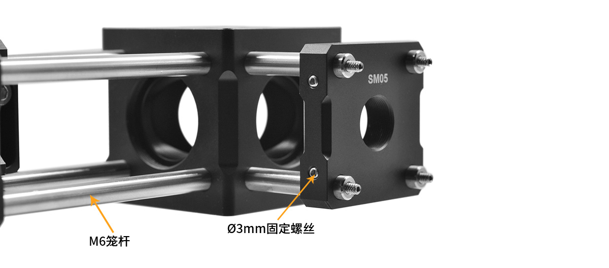 (3) M6通孔可安裝6mm籠桿,每個籠桿通孔的側(cè)面有1個?3mm緊固螺絲,可以通過5/64英寸(2.0mm)六角板手固定;