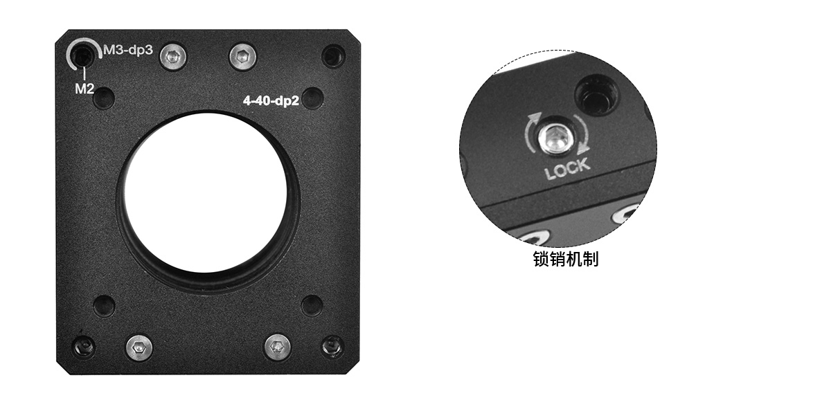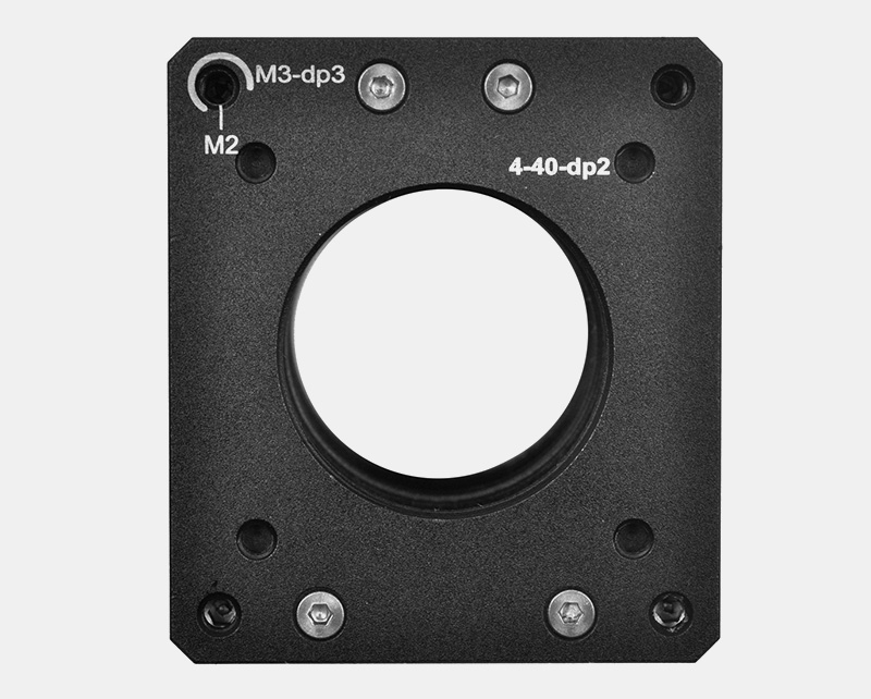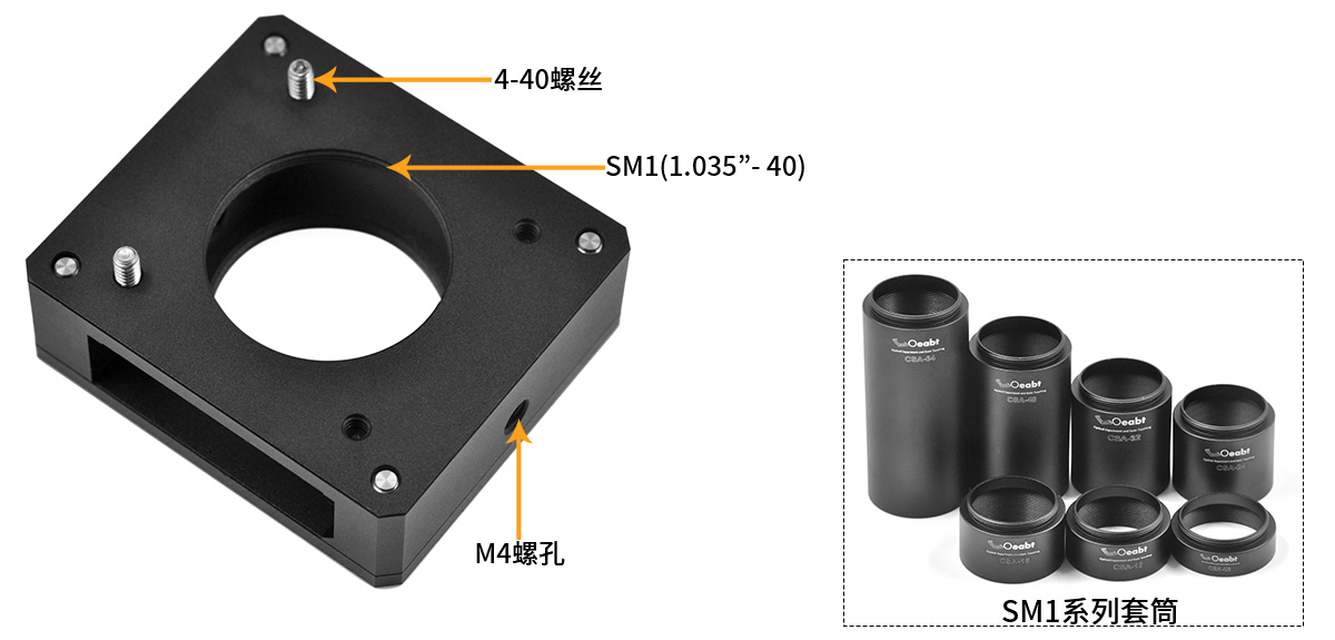 (3)主體面板自帶SM1 (1.035"-40)內(nèi)螺紋,用于兼容SM1系列透鏡套管。面板上4-40螺紋孔用于安裝M6籠桿(附帶8個(gè)4-40螺絲)。