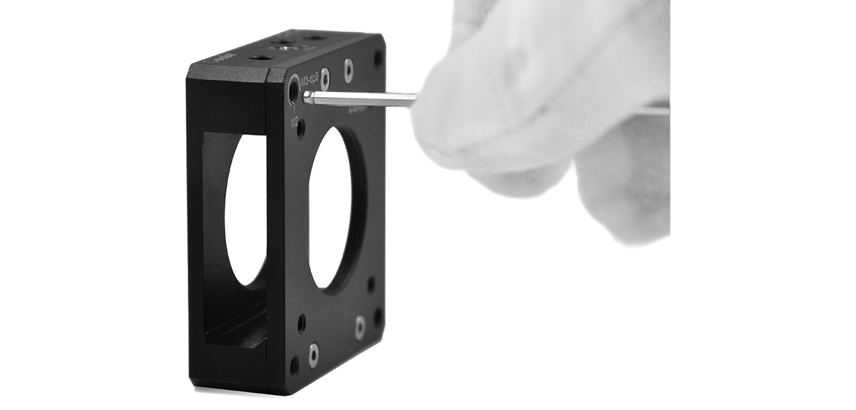 堆疊多個(gè)濾光片安裝座時(shí),將主體面板4邊角的隱藏式螺絲孔,使用2mm六角扳手往內(nèi)前推出隱藏式螺絲,順時(shí)針旋扭擰緊固定。拆解主體時(shí),使用六角扳手(無(wú)需往前推力)逆時(shí)針扭卸即可(有輕微卸扣鎖聲);