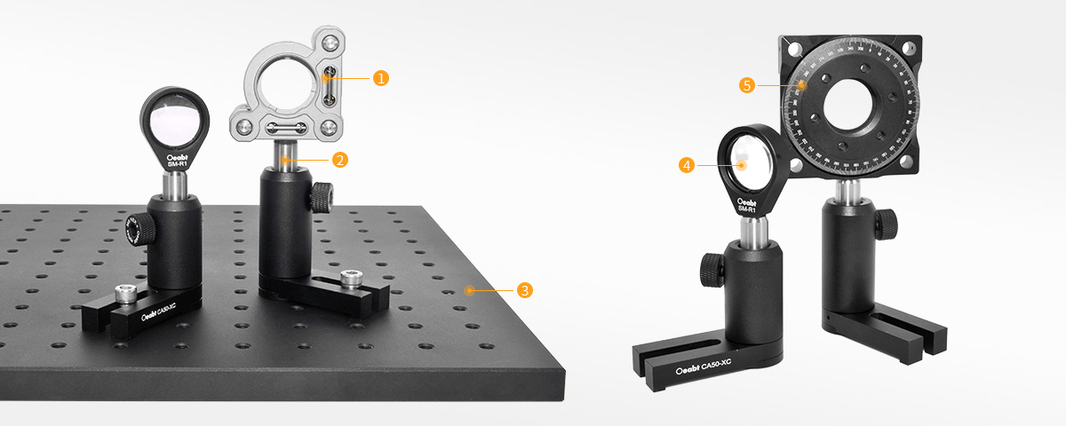 (1)這些接桿支架采用旋轉(zhuǎn)底座,可以在面包板上的多個(gè)安裝孔之間選擇安裝。底座底部的磁鐵有助于在在最后鎖定前為粗略的光學(xué)對(duì)準(zhǔn)提供夾持力,使其與光學(xué)平臺(tái)上的安裝孔共線。360°旋轉(zhuǎn)底座可以為接桿支架增加旋轉(zhuǎn)和磁性定位功能,這樣能夠盡量減少用戶組裝光學(xué)系統(tǒng)的時(shí)間。