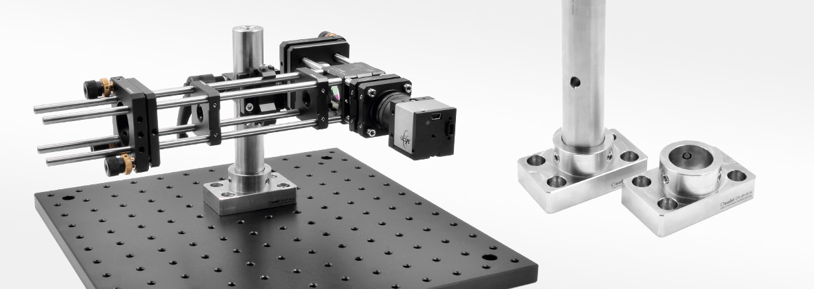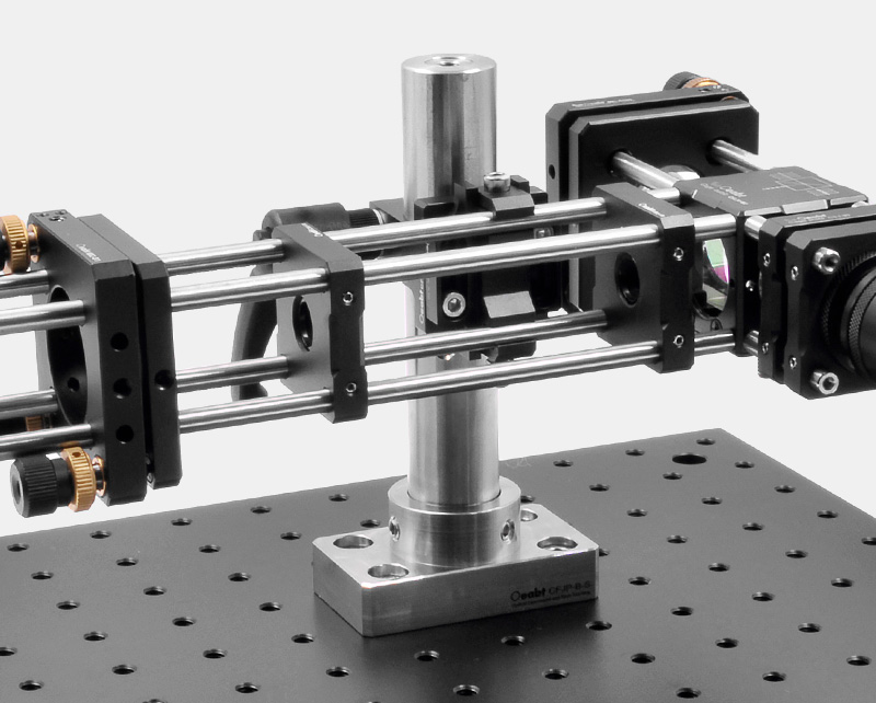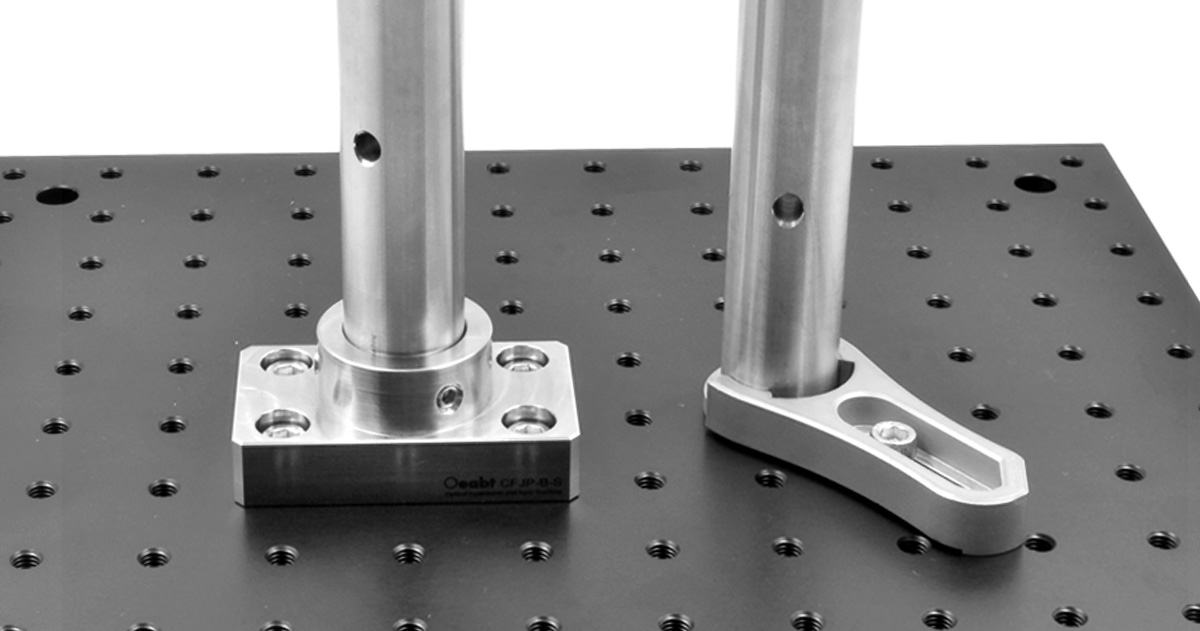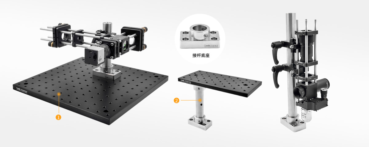 底座用于將CFJP-S系列 ?25mm的接桿安裝至底座,將其轉(zhuǎn)變成底座式接桿。使用側(cè)面的M6緊定螺絲驅(qū)動(dòng)撓性夾持機(jī)制,接桿可旋轉(zhuǎn)360°。在高度調(diào)節(jié)方面,中空的底座允許接桿與光學(xué)平臺(tái)表面直接接觸,將接桿的高度調(diào)節(jié)最大化。相較于叉式壓板,CFJP-B-S接桿底座與平臺(tái)的接觸面更大,能提供的穩(wěn)定性更佳。????