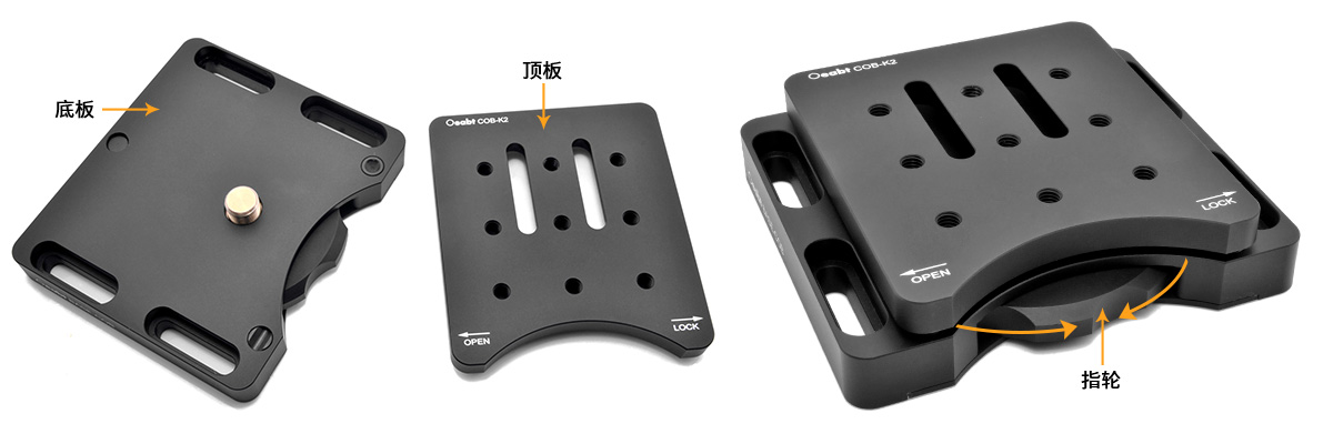 ? 快拆底座,頂板和底板通過轉(zhuǎn)動(dòng)基座指輪即可快速拆卸安裝;