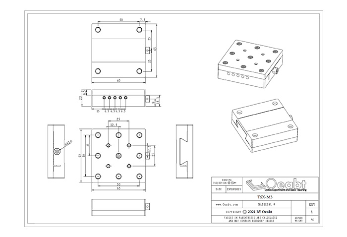 (3)臺面尺寸65*65mm,包含9處M6螺孔、4處M4螺孔,深度為6.4mm。