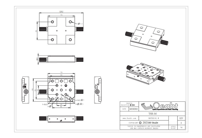 (3)位移臺(tái)上表面的螺紋孔陣列有13處M6螺紋孔,增加了運(yùn)動(dòng)組件的安裝選擇。底面具有4處?7.5mm沉頭孔,可將位移臺(tái)固定到光學(xué)平臺(tái)或面板上。