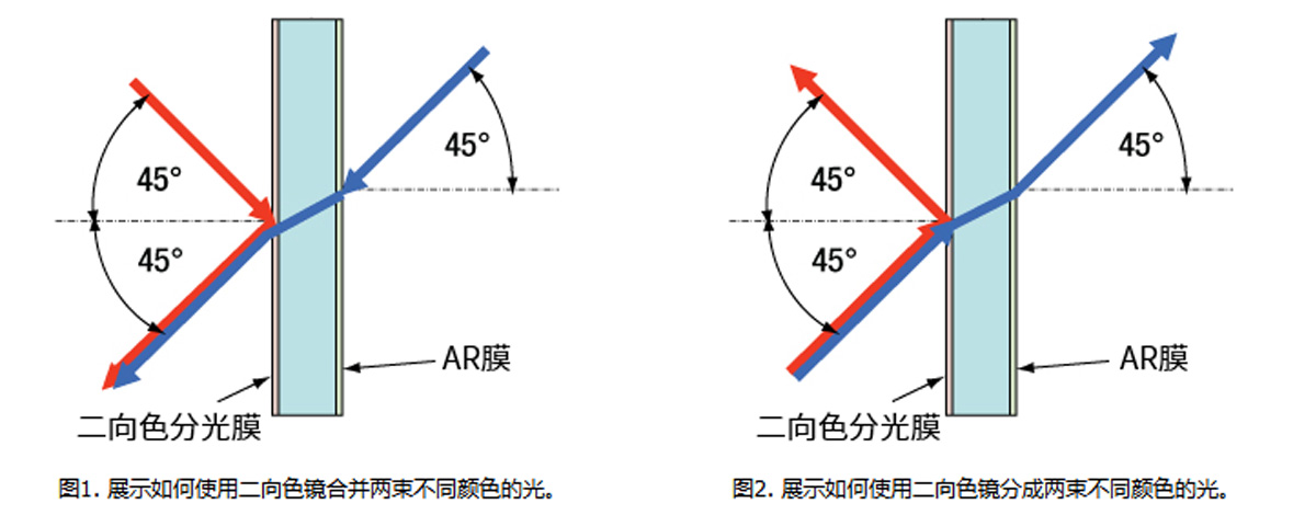 (2)?圖1展示了如何使用二向色鏡/分束鏡合并一束透射光(藍(lán)色) 和一束反射光(紅色) 。透射光束的波長(zhǎng)處于光學(xué)元件的透射波段,而反射光束的波長(zhǎng)處于光學(xué)元件的反射波段。如果傳輸方向反過(guò)來(lái),這個(gè)光學(xué)元件就相當(dāng)于分束鏡,如圖2所示。