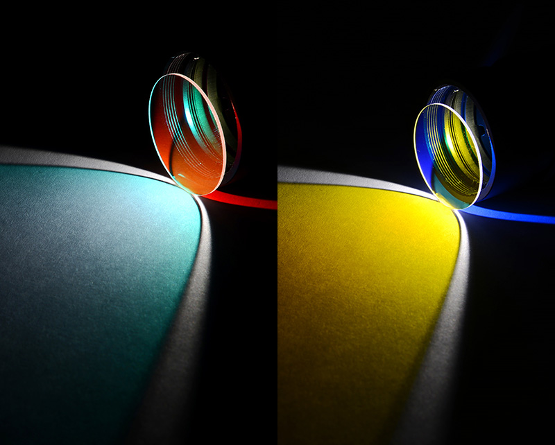 一面鍍二向色膜,另一面鍍?cè)鐾改ぁ?duì)低于截止波長(zhǎng)的光束具有高透性,且對(duì)于高于截止波長(zhǎng)的光束具有高反性,長(zhǎng)波通則相反。這種光學(xué)元件也可以用于將一束波長(zhǎng)(或波長(zhǎng)范圍)小于截至波長(zhǎng)的光束與一束波長(zhǎng)(或波長(zhǎng)范圍)大于截至波長(zhǎng)的光束相結(jié)合。通常它們還用于將不同顏色空間疊加的光分離。當(dāng)做分束應(yīng)用時(shí),建議將入射光從二向色膜面入射。