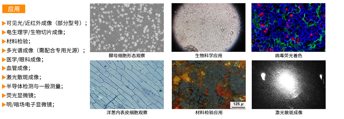 ? 應(yīng)用:可見光/近紅外成像;電生理學(xué)/生物切片成像;材料檢驗;多光譜成像(需配合專用光源);醫(yī)學(xué)/眼科成像;血管成像;激光散斑成像;半導(dǎo)體檢測與一般測量;熒光顯微鏡;明/暗場電子顯微鏡;