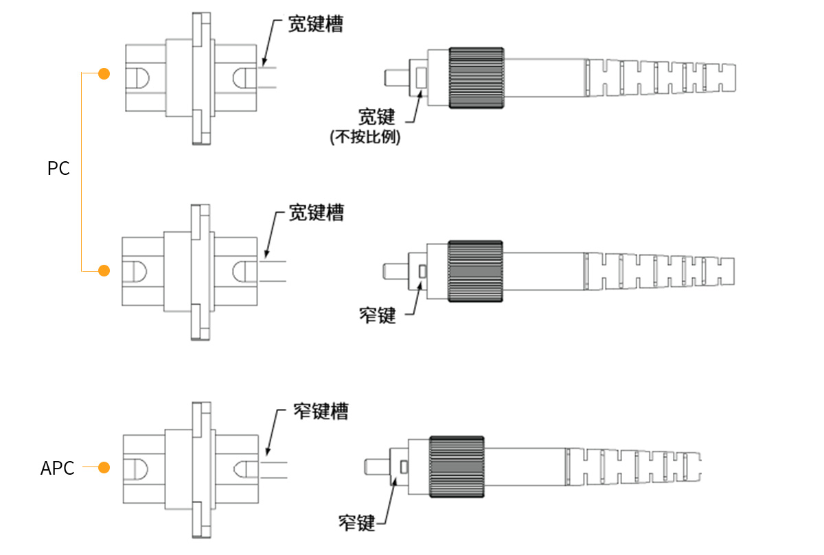 (2)平坦的FC/PC接頭的對準(zhǔn)靈敏度明顯比帶角度的FC/APC接頭的靈敏度低,所以AD-PC系列寬鍵槽匹配套管可以用于窄鍵和寬鍵FC/PC接頭。而AD-APC系列窄鍵槽套管可以良好對準(zhǔn)帶角度的窄鍵FC/APC接頭。