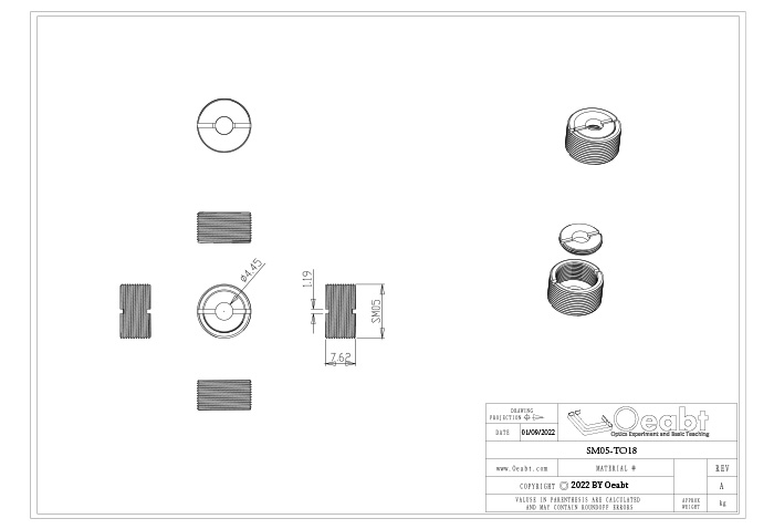 二極管安裝座主要用于安裝TO18、?TO-5的激光二極管,具有SM05(0.535"-40)螺或SM1(1.035"-40)螺紋。便于對準激光二極管和透鏡套筒的軸心,實現(xiàn)SM螺紋組件的裝配。二極管可利用附帶的卡環(huán)安裝固定。