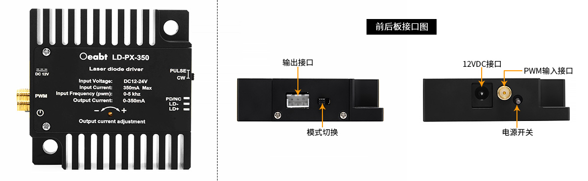 1.可以通過接外部脈沖信號(PWM)方式對LD發(fā)光管進行頻率和亮度進行調(diào)節(jié),頻率范圍為0-5kHz,占空比范圍為0-100%。