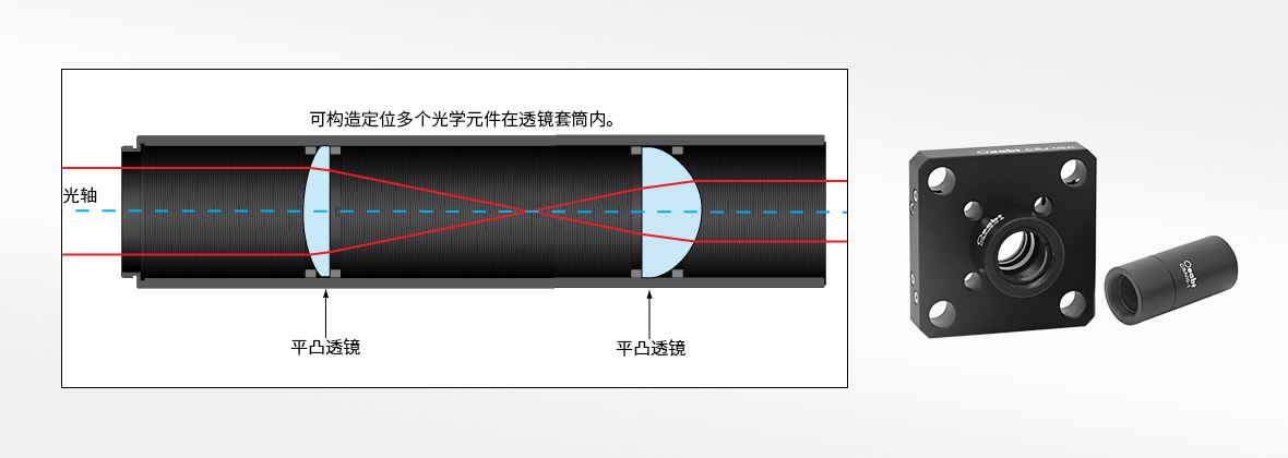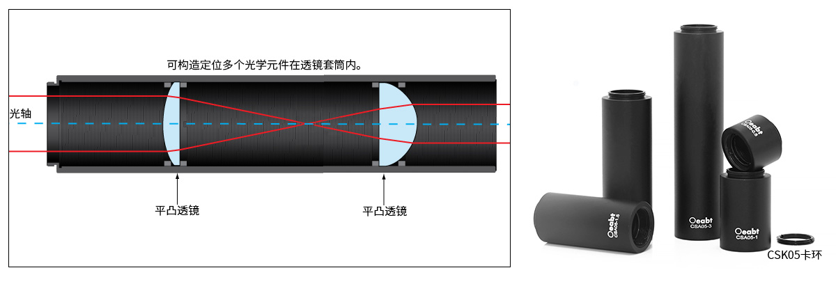 透鏡套筒兼容安裝?1/2英寸(12.7mm)的光學(xué)元件,每個(gè)套筒附帶1個(gè)CSK05卡環(huán),光學(xué)元件通過卡環(huán)分隔和固定。
