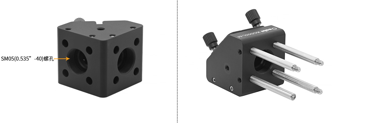 (3)入射和出射端口都具有SM05螺紋(0.535"-40)孔,方便與其他光學元件進行連接。而調(diào)整架的八個深度為5.0mm的孔,則使其與16mm籠式系統(tǒng)中使用的SPCM系列籠桿兼容,并可通過1.3mm六角固定螺絲進行擰緊鎖定。