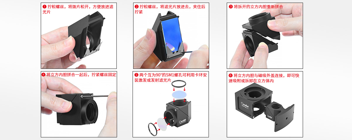 MDFM-C顯微熒光立方內(nèi)部可以安裝1個(gè)濾光片立方,頂部和底部的公母頭燕尾塊可以相互匹配,實(shí)現(xiàn)立方模塊的堆疊應(yīng)用。
