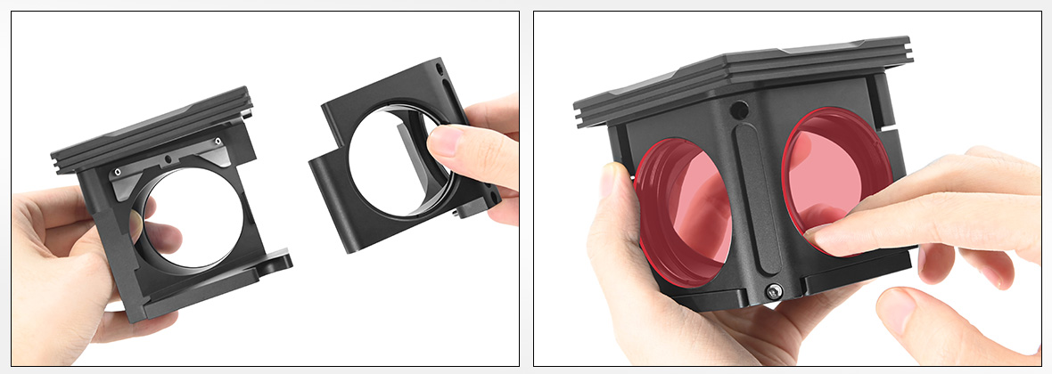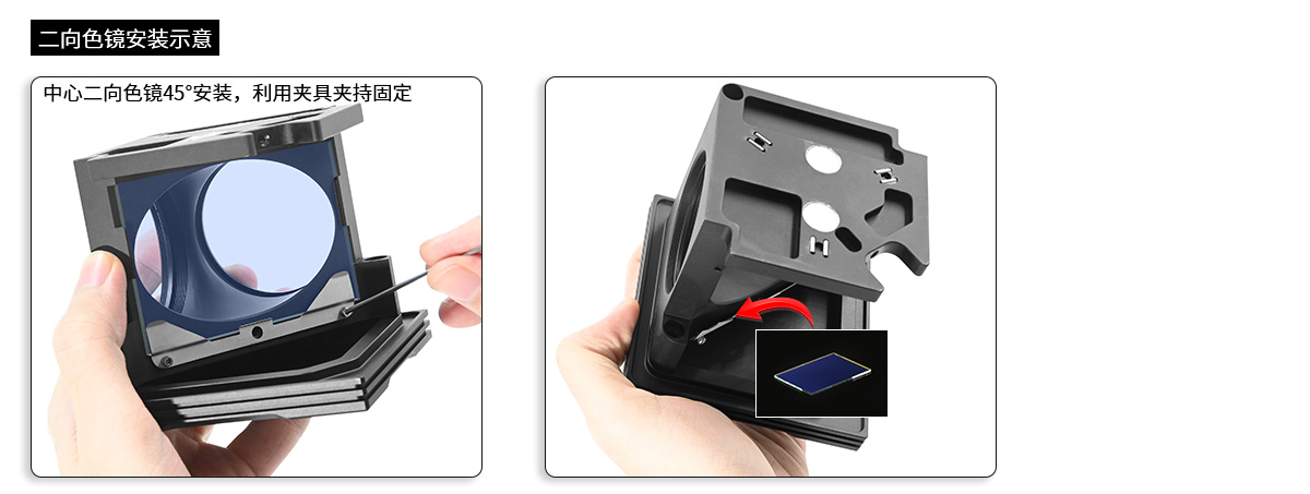 立方插件組用于安裝?2英寸光學(xué)元件(如激發(fā)和發(fā)射濾光片),和在中心安裝50.8*72.0mm的分束矩形立方(厚度≥2mm且≤3mm)。
