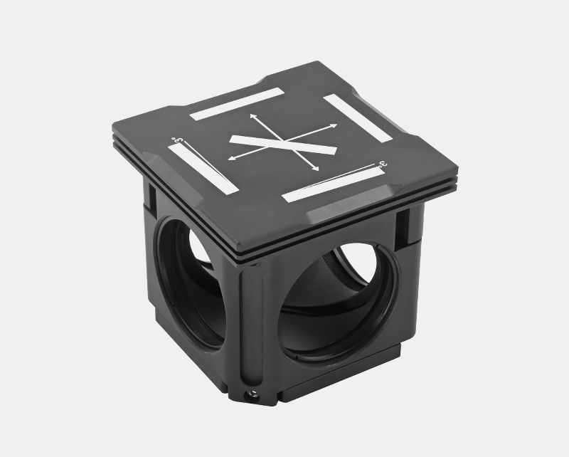 (1)立方體用于將熒光濾光片組二向色鏡、激發(fā)濾光片和發(fā)射濾光片)安裝在兼容籠式系統(tǒng)的立方中,適合自搭建的顯微鏡裝置。蓋板頂部刻有分束器位置圖,指示通過立方的光路。(發(fā)射端口位置相對(duì)表面呈3°角,以減少不必要的反射)。