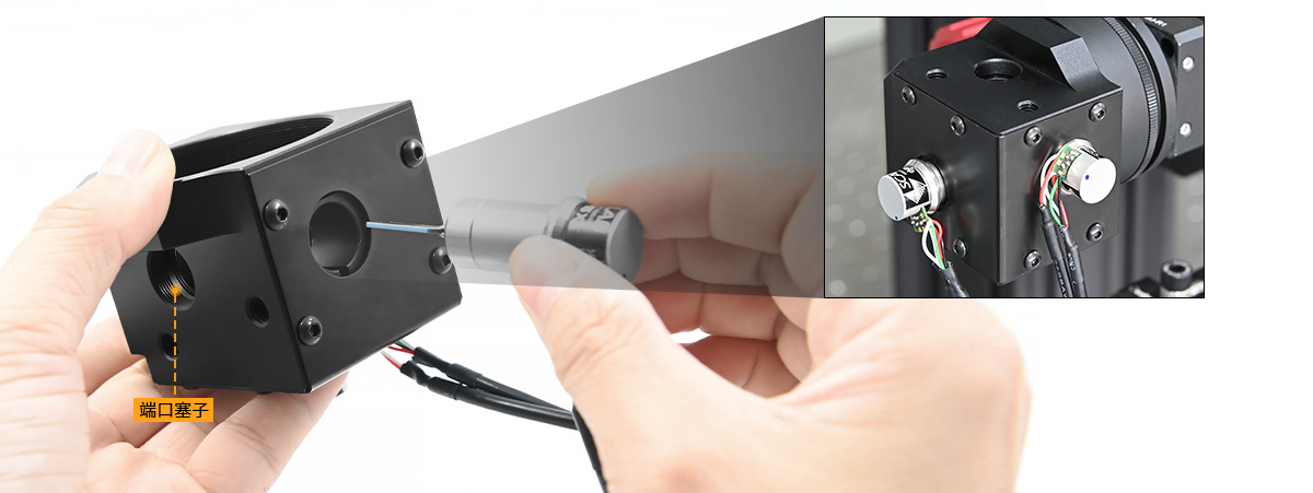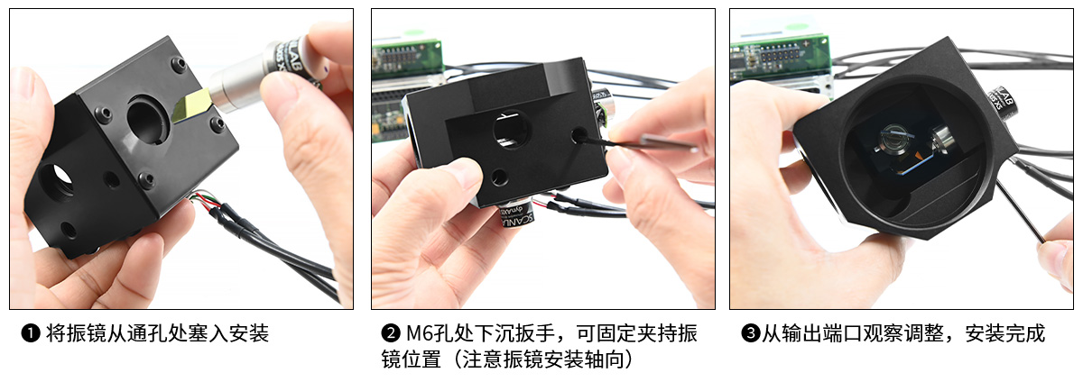 3)X軸和Y軸振鏡通過兩側面的通孔安裝。兩處M6通孔,可插入3mm六角扳手協(xié)助擰緊撓性夾具,從而固定/拆卸振鏡的位置。上方的SM05螺孔處的端口塞子可拆卸,做觀察孔協(xié)助振鏡安裝。
