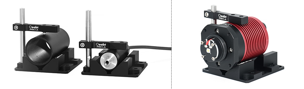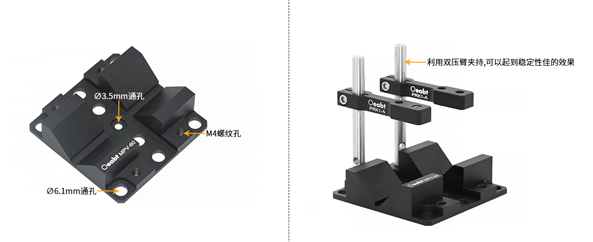 V型夾持座設(shè)計用于夾持?13.5-?42.0mm范圍內(nèi)圓柱形物體,圓柱物體通過PRK1-A壓臂上的帶2.0mm六角的尼龍頂絲將光學(xué)元件固定到帶平臺的調(diào)整座和V形壓塊。
