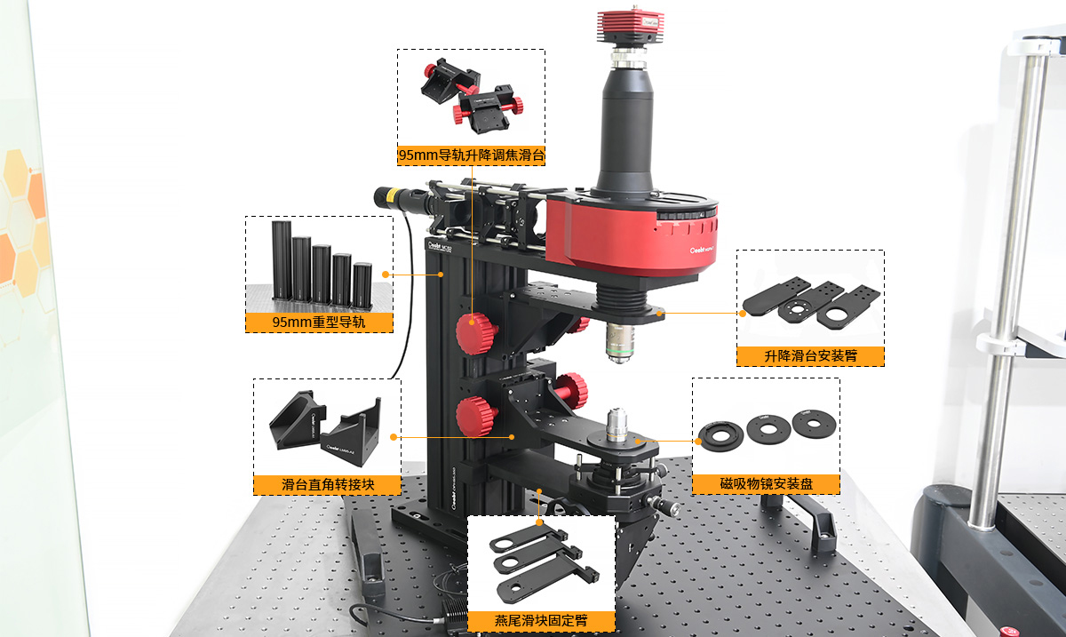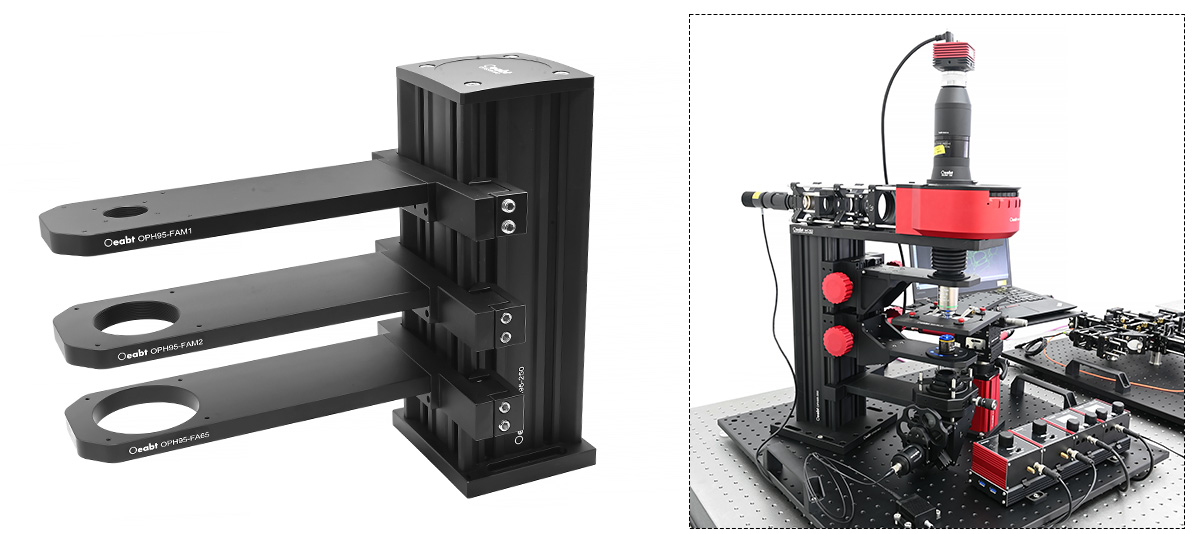 有多種類型的安裝臂架,可以將物鏡、聚光鏡、微距鏡頭和透鏡套筒或籠式系統(tǒng)沿光軸集成對準,支持自搭建聚光鏡或其他光機組件。