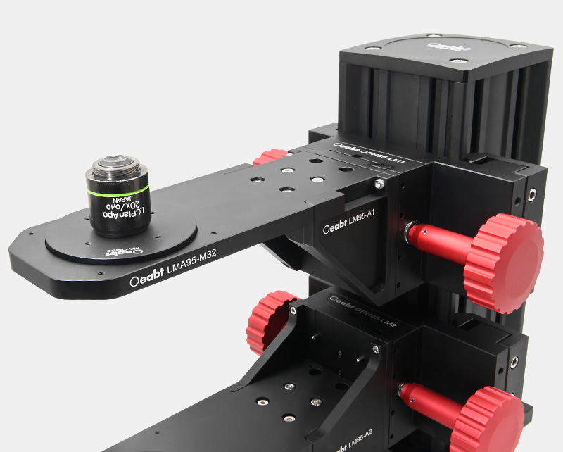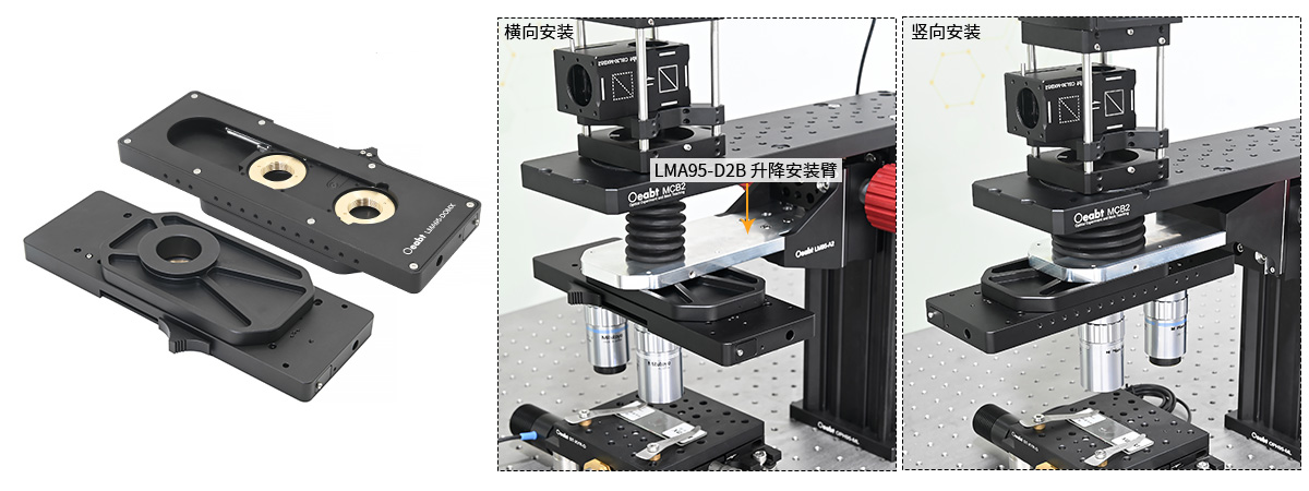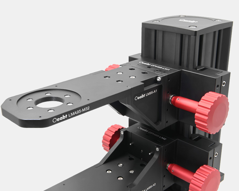(3)安裝臂具有SM2螺孔款、M32螺孔款、實心款平臺,可以將透鏡套筒或籠式系統(tǒng)沿光軸對準,光軸距離主體支架導軌邊緣196.5mm。LMA95-M32安裝臂額外具有磁吸表面,可嵌入磁吸物鏡安裝盤快速切換安裝物鏡。