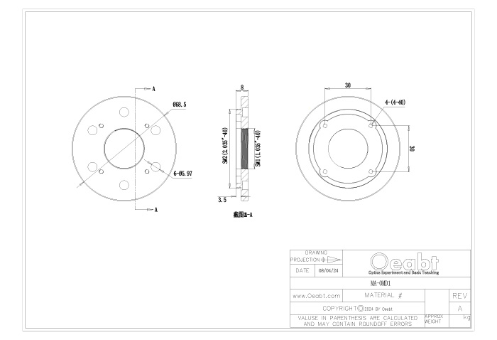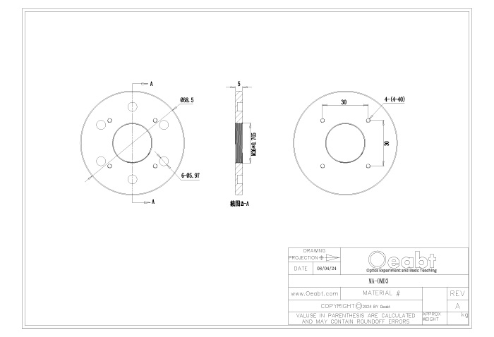 (4)表面6處M4螺孔,與安裝臂/物鏡安裝架連接。可額外單獨購買直角塊,具有4處M3沉頭孔安裝,附帶定位銷便于校準。