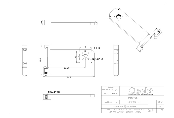 (6)OPH-L系列燕尾固定臂背面有一個95mm的燕尾夾,可以直接固定到主體支架的表面任意處。為用戶自建的光學路徑提供結構支持,通過擰緊兩個4mm的固定螺絲。同樣在距離豎直導軌邊緣196.5mm的光路處定位光學端口。