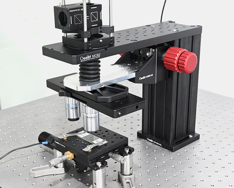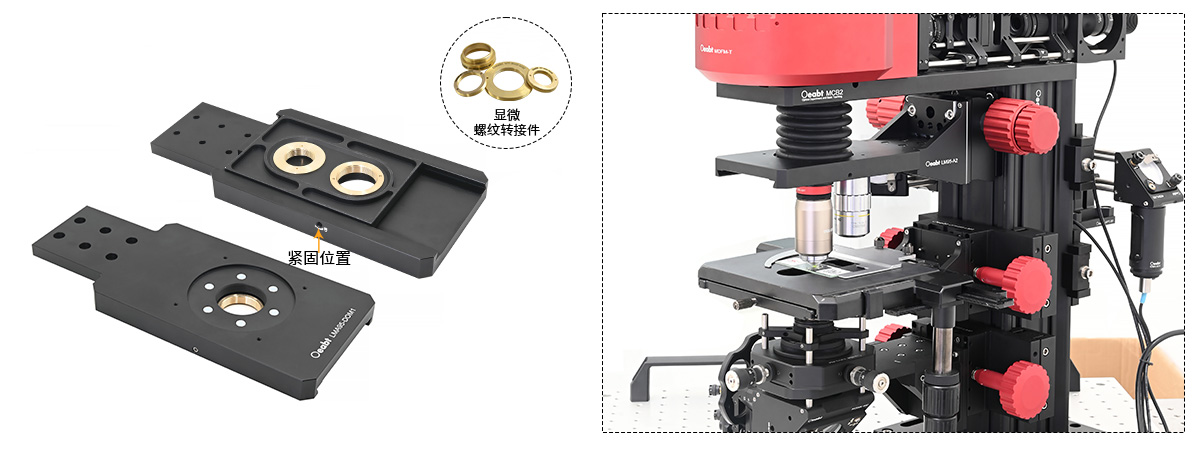 (4)雙物鏡滑動式安裝架可將兩個物鏡同時安裝在光學顯微系統(tǒng)中,非常適合搭建用低放大倍率物鏡尋找感興趣區(qū)域、用高放大倍率成像的系統(tǒng)。內螺紋兼容M32*0.75,且附帶RMS螺紋轉接件用于連接物鏡。另還提供顯微螺紋轉接件選擇,將M32*0.75螺紋轉接為其他的物鏡螺紋,需另外購買)