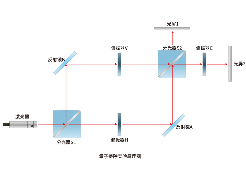量子擦除實驗基本結構包括兩個分光器、兩個反射鏡、一個合束器和一個偏振器。