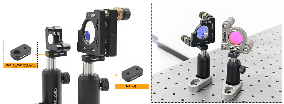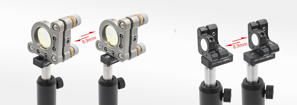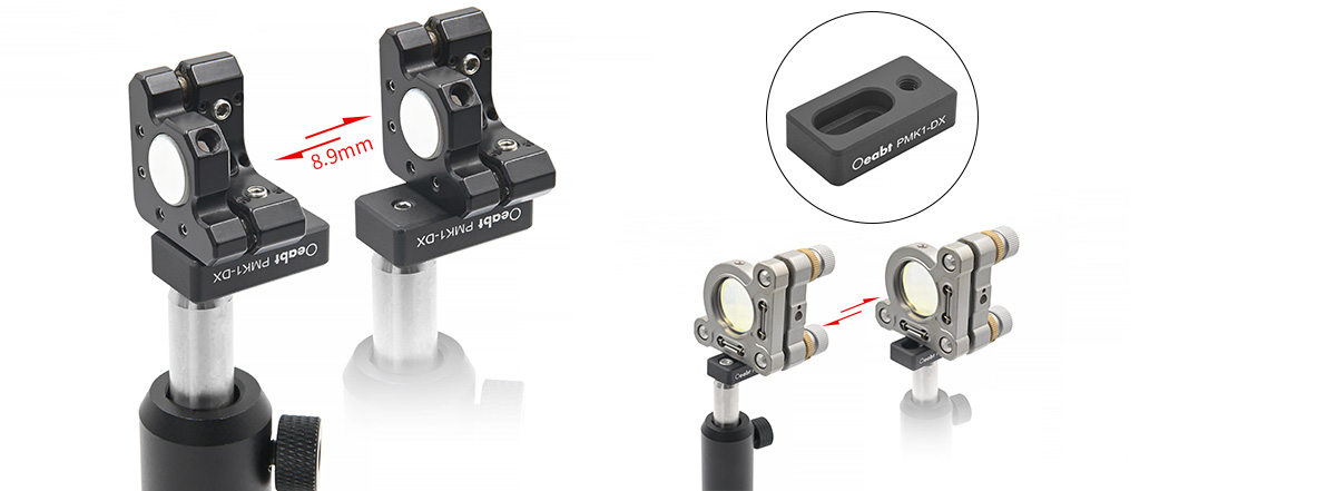(3)PMK1-DX定心板沉頭孔槽中心可移動(dòng)范圍為15.1-24.0mm,使得鏡座前表面的位置調(diào)整范圍達(dá)到8.9mm。在空間受限無(wú)法使用接桿的情況下,PMK1-DX也能作為延伸板使用,將安裝座置入光路中。