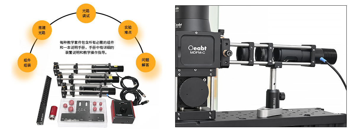 ? Oeabt教學(xué)演示系列產(chǎn)品旨在通過各種經(jīng)典實驗來促進物理學(xué)、光學(xué)、光子學(xué)以及各種新興研究領(lǐng)域的發(fā)展。每種教學(xué)套件包含所有必需的組件和一本說明手冊,手冊中有詳細的裝置說明和教學(xué)操作指導(dǎo)。