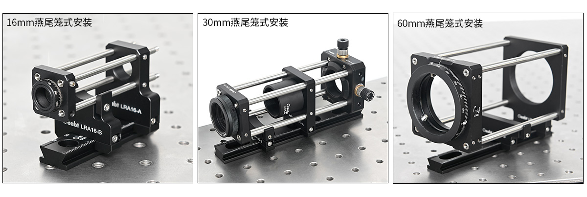 (5)燕尾籠板座系列用于將16mm、30mm或60mm籠式系統(tǒng)安裝到燕尾導(dǎo)軌,使安裝好的籠式系統(tǒng)中心對齊30mm或50mm的光軸高度(從導(dǎo)軌的上表面開始測量)。燕尾夾持設(shè)計便于根據(jù)應(yīng)用要求拆卸或增添籠式系統(tǒng)組件。