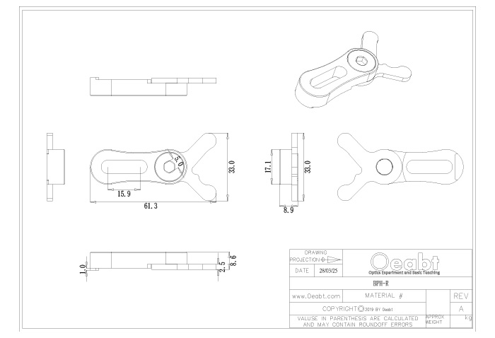 (1)當(dāng)方形光學(xué)組件(如底座、鏡架等)從系統(tǒng)中移出后,位置固定器可作為標(biāo)記物,確保組件能快速、準(zhǔn)確地恢復(fù)到原始位置,避免重復(fù)校準(zhǔn)。通過固定器的3個接觸點對準(zhǔn)組件的邊角,確保定位精度。主要分為旋轉(zhuǎn)式(BPH-R)和固定式(BPH-A)兩種。