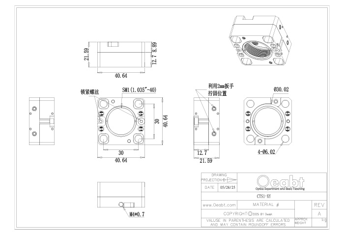 CTS1-XY平移滑板是為30mm籠式系統(tǒng)中的光學(xué)元件在XY方向進(jìn)行粗略定位,提供±1mm的調(diào)節(jié)范圍。