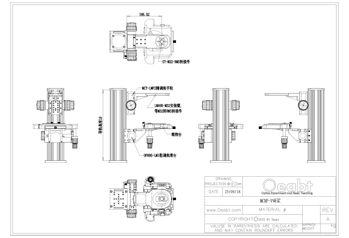 S/N0009或S/N0010載物臺、OPH95-V系列95mm導軌、MCT-LMP2調焦手輪、LMP2-A直角支架、LMA95-M32安裝臂、ST-M32-RMS轉接件、OPH95-LM1調焦滑臺、LMA95-Olympus安裝臂、OOP95-M滑塊 |
