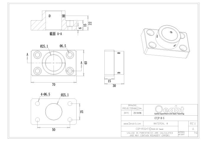 ? 不銹鋼底座:303實(shí)心制成,CFJP-B-S兼容?25mm或?1英寸接桿;CFEP-B-S可安裝?1.5英寸接桿; 可用M6柱頭螺絲的間隙槽可以將其安裝到面包板或光學(xué)平臺(tái)上;